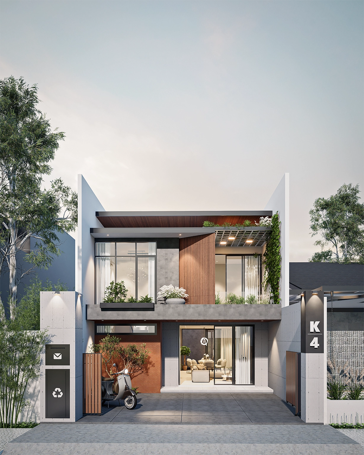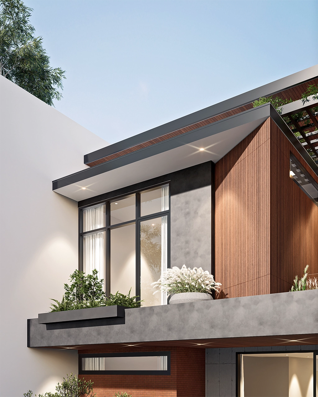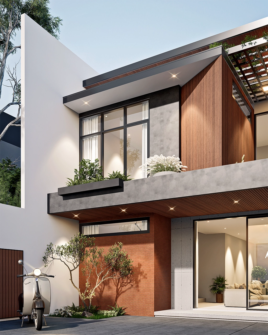Penerapan konsep modern kontemporer dipilih sebagai represenasi user yang lahir di generasi milenial. Permainan ekspos material seperti bata, semen, kayu dan kaca memberikan kesan yang kuat pada bangunan ini. Penggunaan bukaan lebar sebagai penanda bahwa owner adalah orang yang extrovert dan menjadi sumber cahaya serta udara alami. Menggabungkan kesederhanaan desain modern dengan elemen tropis, seperti penggunaan kayu pada dinding dan atap, serta tanaman hijau di sekiar rumah.
