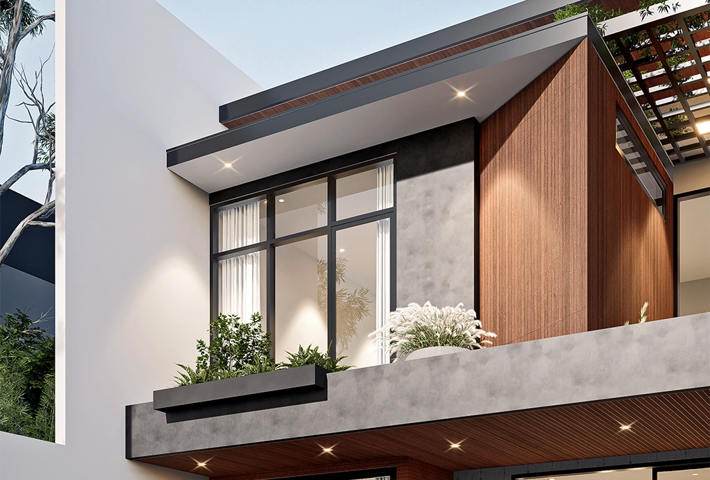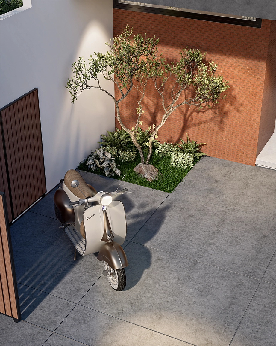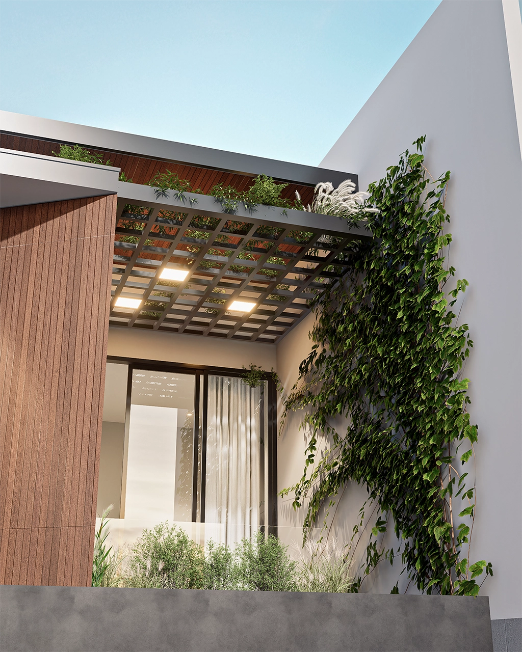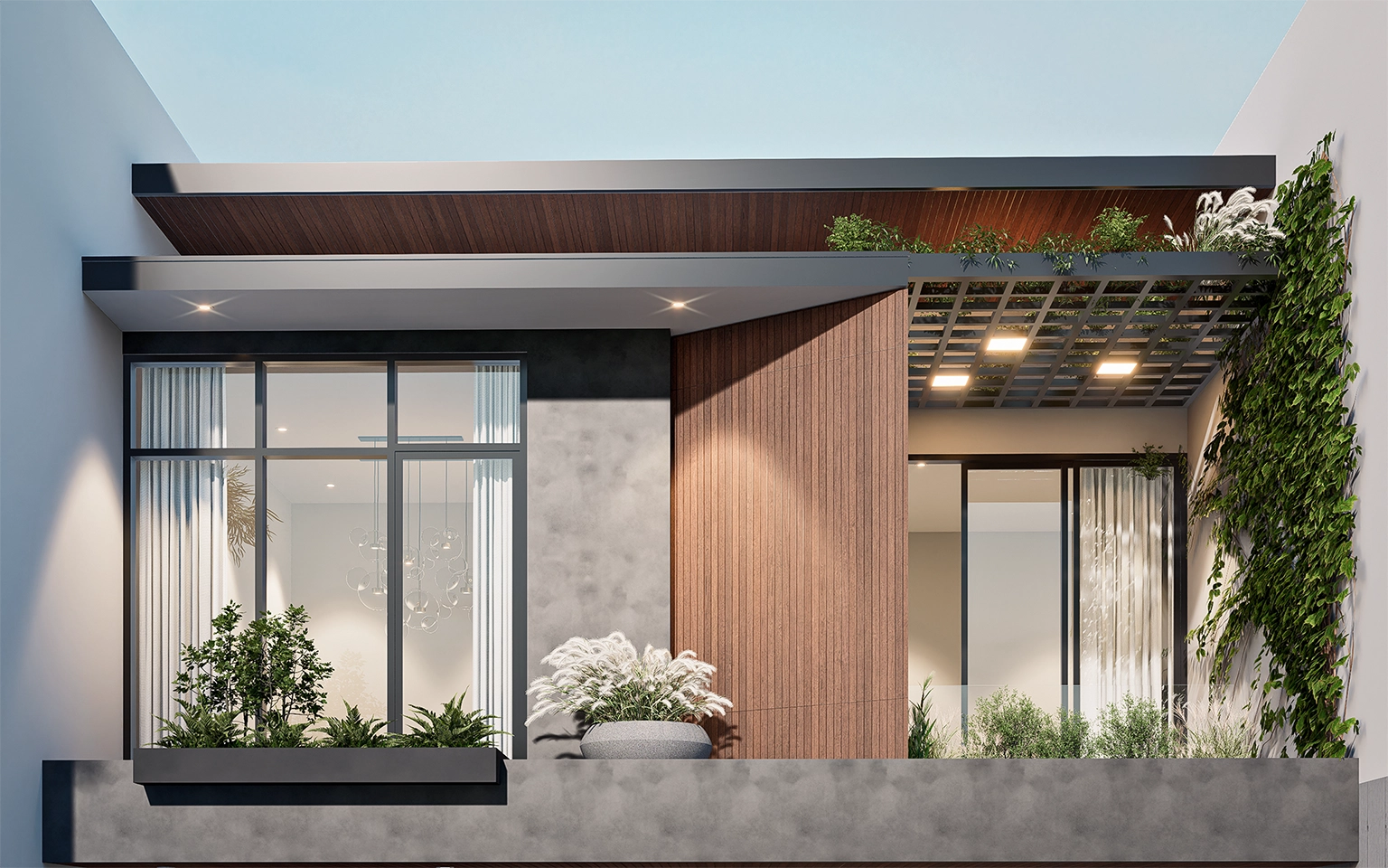 Penerapan konsep modern kontemporer dipilih sebagai represenasi user yang lahir di generasi milenial. Permainan ekspos material seperti bata, semen, kayu dan kaca memberikan kesan yang kuat pada bangunan ini. Penggunaan bukaan lebar sebagai penanda bahwa owner adalah orang yang extrovert dan menjadi sumber cahaya serta udara alami. Menggabungkan kesederhanaan desain modern dengan elemen tropis, seperti penggunaan kayu pada dinding dan atap, serta tanaman hijau di sekiar rumah.