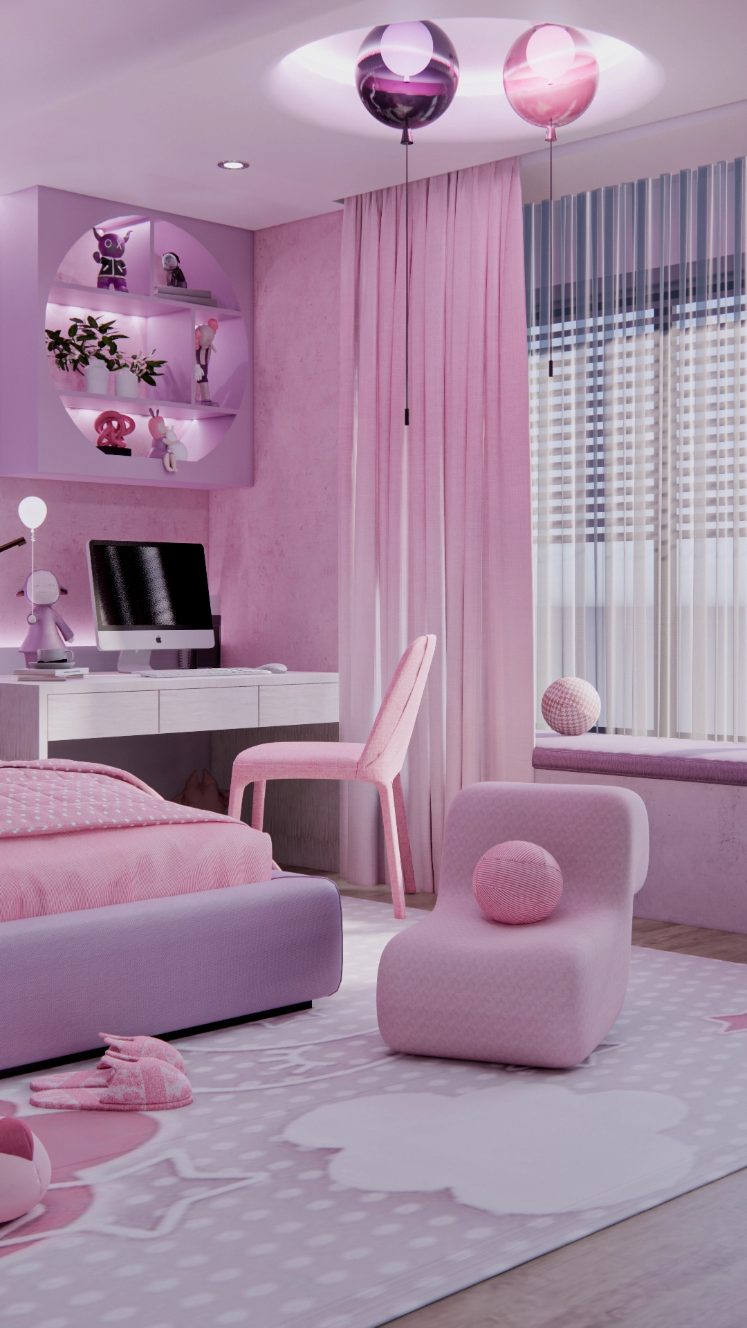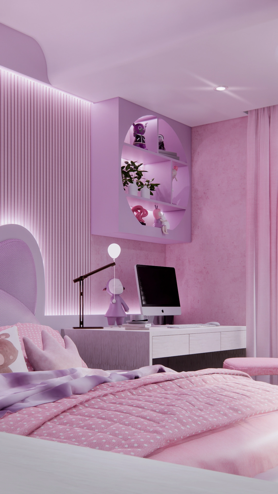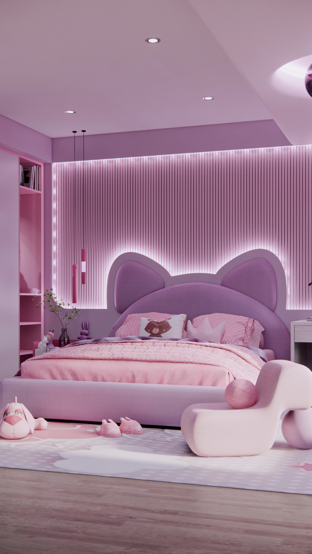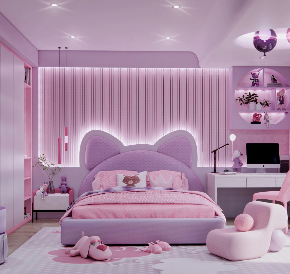 Kamar ini dirancang untuk menghadirkan suasana hangat dan ceria khas anak perempuan, memadukan pink muda yang manis dengan ungu lilac sebagai aksen yang memikat. Layout furnitur disusun dengan cermat, menciptakan komposisi ruang yang harmonis dan selaras dengan permainan warna, sehingga menghadirkan ruang yang nyaman, estetik, dan penuh imajinasi.