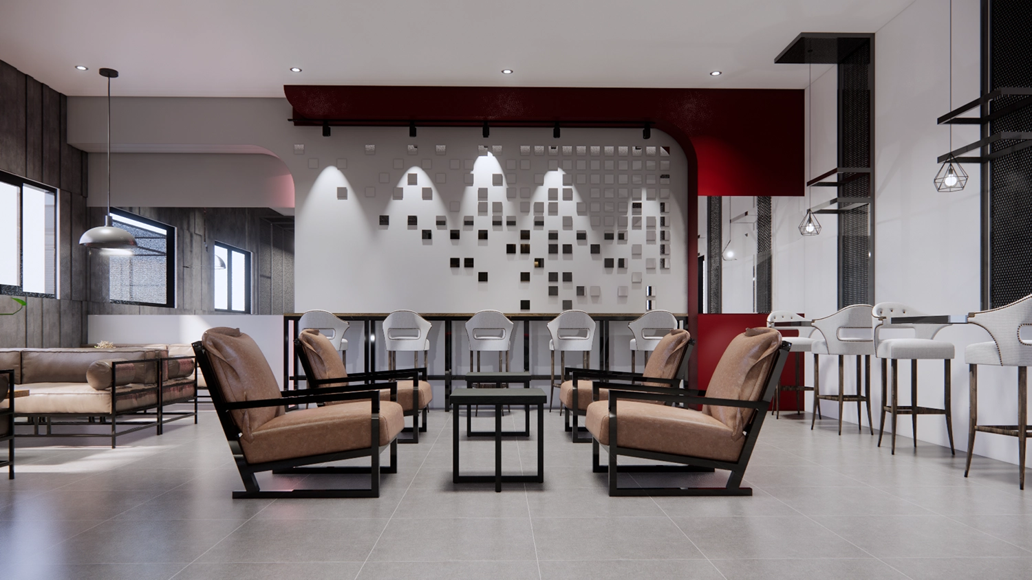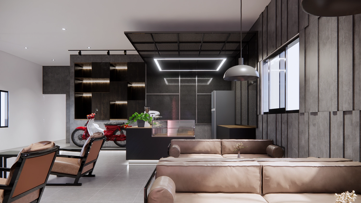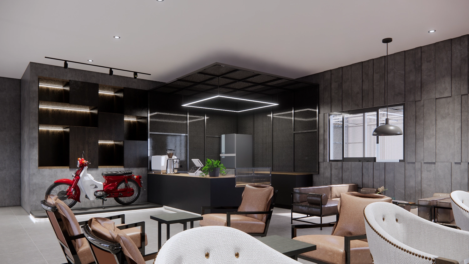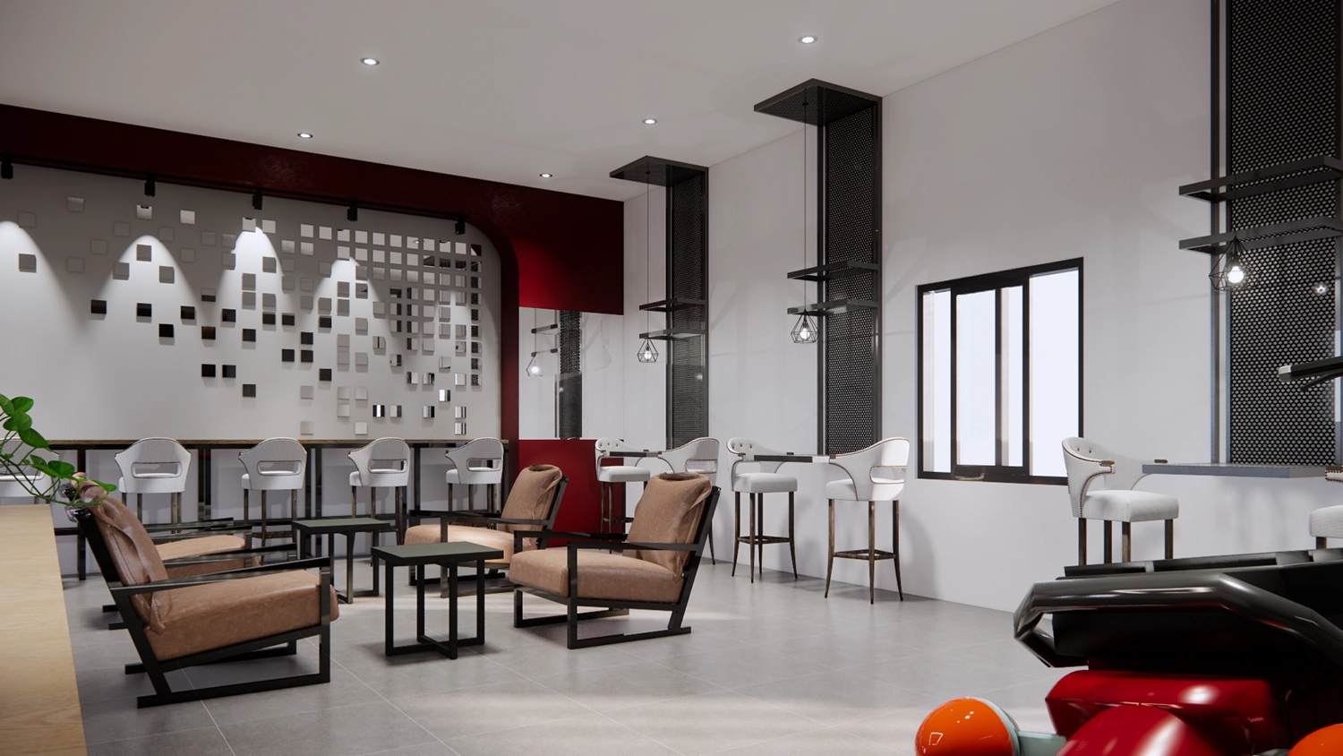 Perpaduan estetika industrial yang tegas dengan sentuhan kontemporer dan modern, menghadirkan suasana kafe yang hangat namun tetap stylish. Lantai abu-abu yang netral menjadi dasar yang kokoh, dinding putih memberi kesan lapang, sementara aksen merah membangkitkan energi ruang. Sebagian dinding berfinishing concrete menghadirkan karakter industrial yang autentik, berpadu harmonis dengan permainan furnitur besi dan kayu yang fungsional sekaligus estetis. Sebagai pusat perhatian, sebuah motor antik lama dihadirkan sebagai karya seni, menjadi cerita unik yang menghidupkan atmosfer dan memperkuat identitas kafe ini. Sebuah ruang yang dirancang untuk menjadi destinasi nongkrong yang nyaman, fotogenik, dan berkarakter.