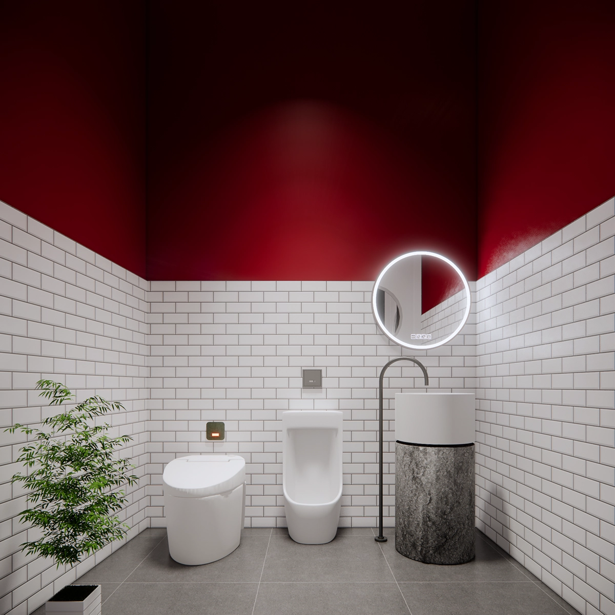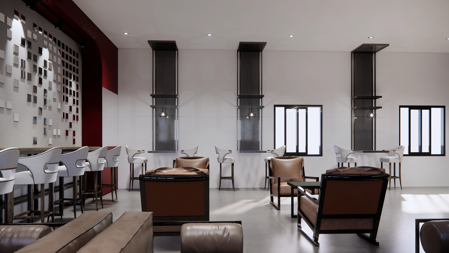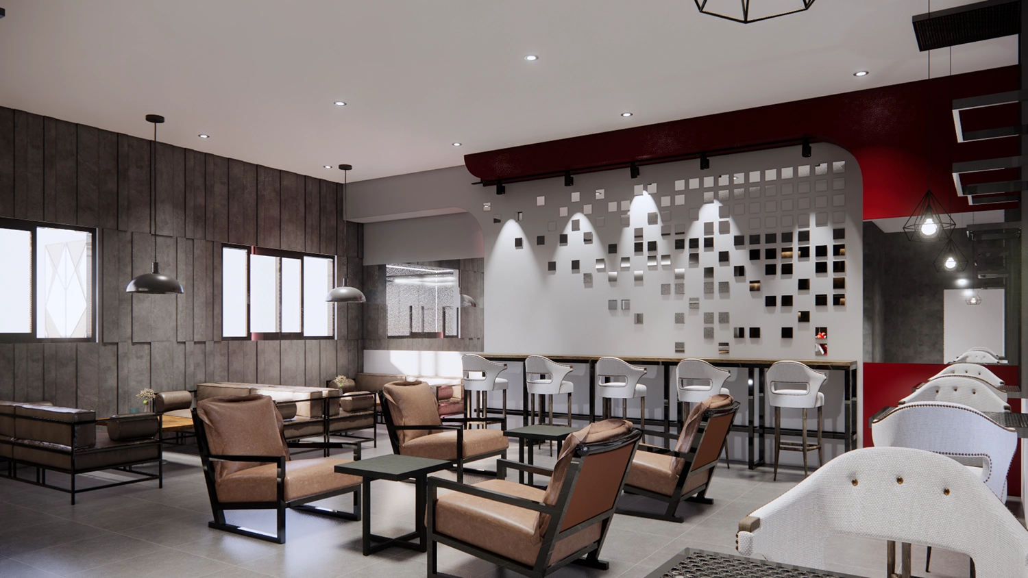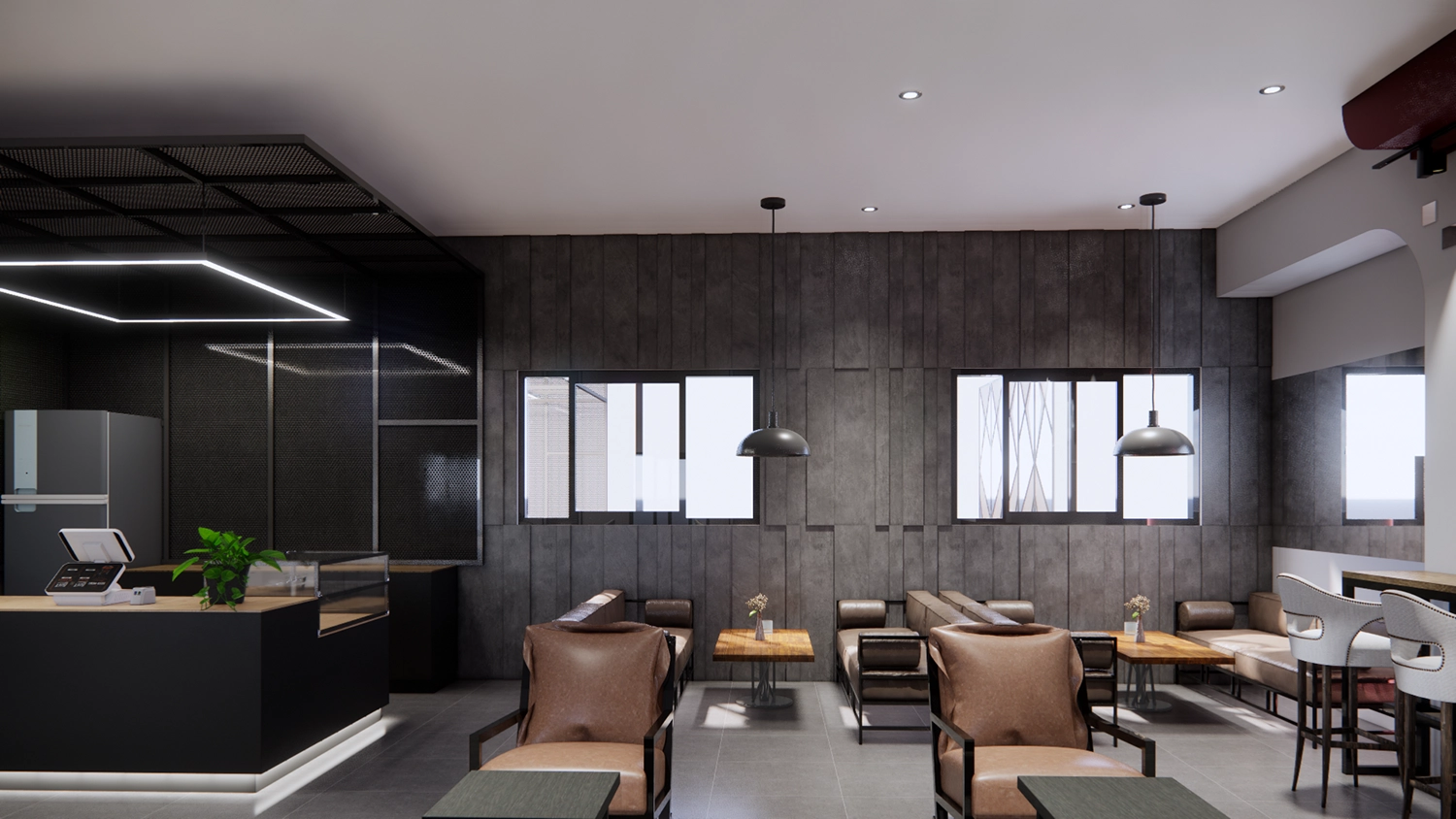 Perpaduan estetika industrial yang tegas dengan sentuhan kontemporer dan modern, menghadirkan suasana kafe yang hangat namun tetap stylish. Lantai abu-abu yang netral menjadi dasar yang kokoh, dinding putih memberi kesan lapang, sementara aksen merah membangkitkan energi ruang. Sebagian dinding berfinishing concrete menghadirkan karakter industrial yang autentik, berpadu harmonis dengan permainan furnitur besi dan kayu yang fungsional sekaligus estetis. Sebagai pusat perhatian, sebuah motor antik lama dihadirkan sebagai karya seni, menjadi cerita unik yang menghidupkan atmosfer dan memperkuat identitas kafe ini. Sebuah ruang yang dirancang untuk menjadi destinasi nongkrong yang nyaman, fotogenik, dan berkarakter.
