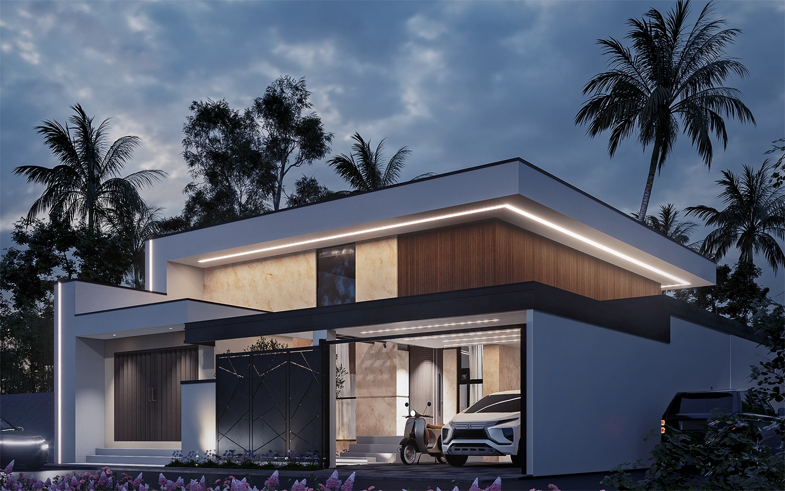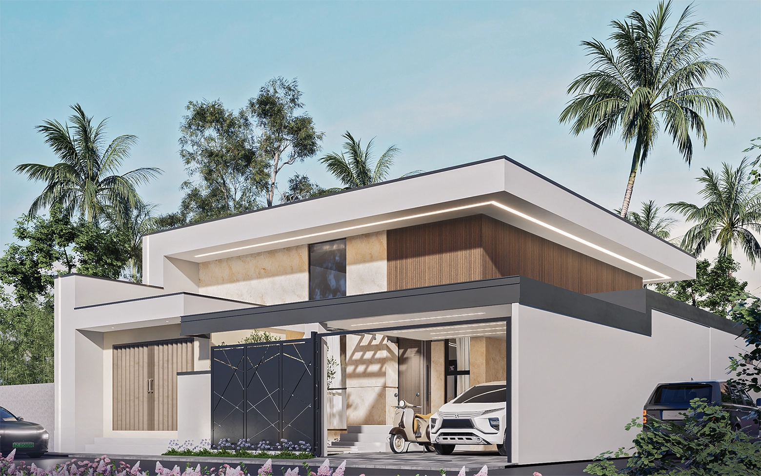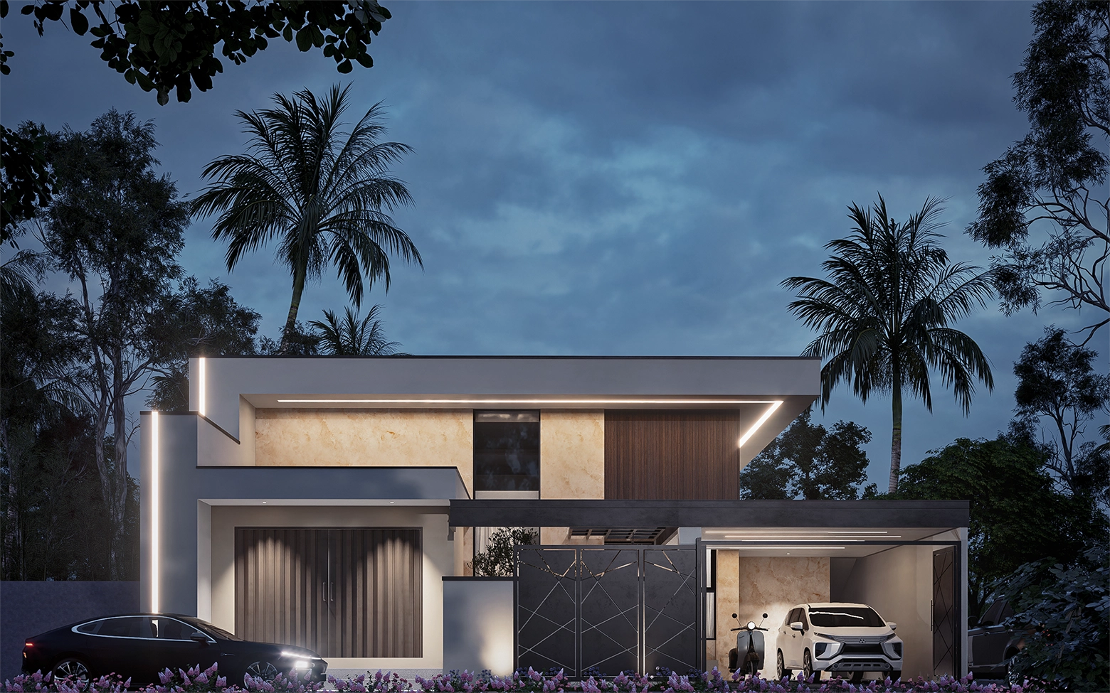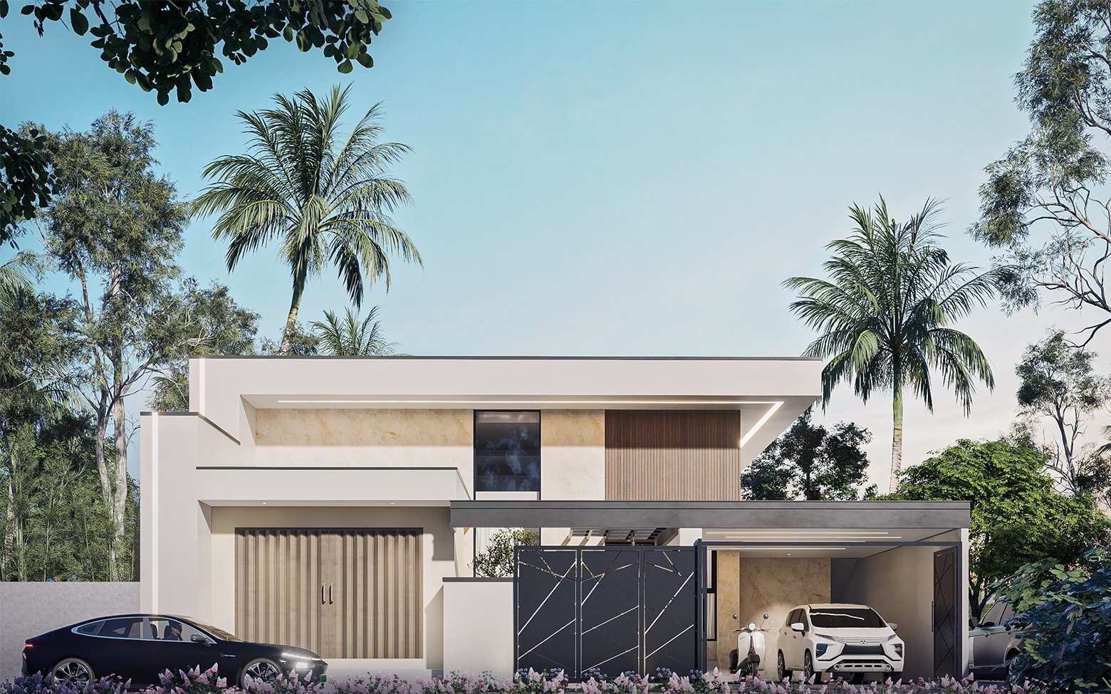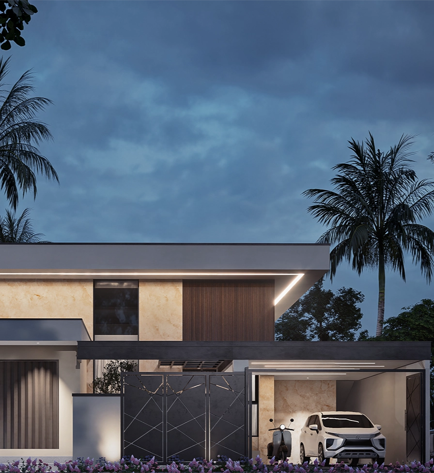 Villa satu lantai ini memadukan kesederhanaan modern dengan sentuhan alam tropis khas Indonesia. Warna putih menjadi kanvas bersih yang memantulkan cahaya alami, dipadukan dengan material kayu yang menghadirkan kehangatan, dan aksen hitam yang memberi karakter tegas. Setiap sudut dirancang untuk memaksimalkan sirkulasi udara dan pencahayaan alami, menghadirkan kesejukan tropis, sekaligus menawarkan kenyamanan hangat bagi penggunanya.